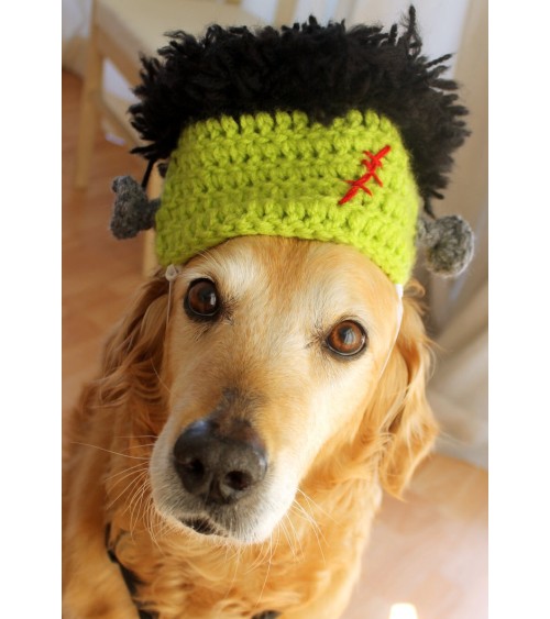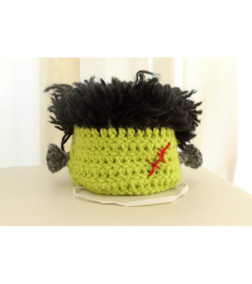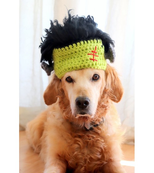 Frankenstein-inspired look: Bright green headband with stitched detail and a wild “monster hair” top for an instant spooky transformation.